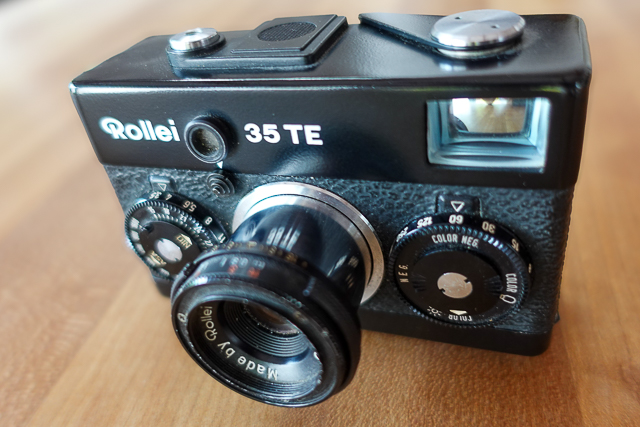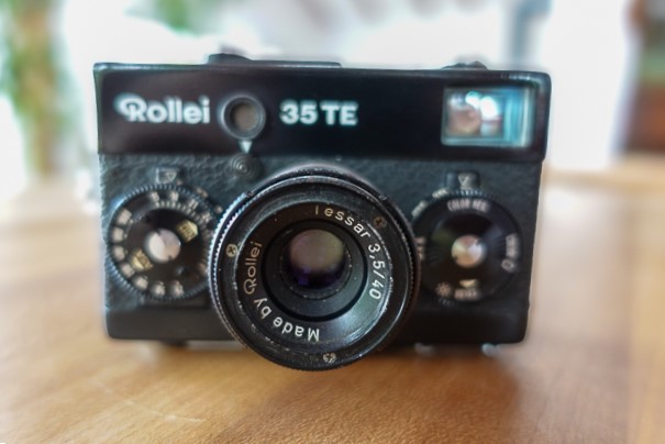 Besonderheit: DazugeRollei 35 TE mit Tessar 40mm f/3.5 Objektivhöriger Voigtländer-Blitz